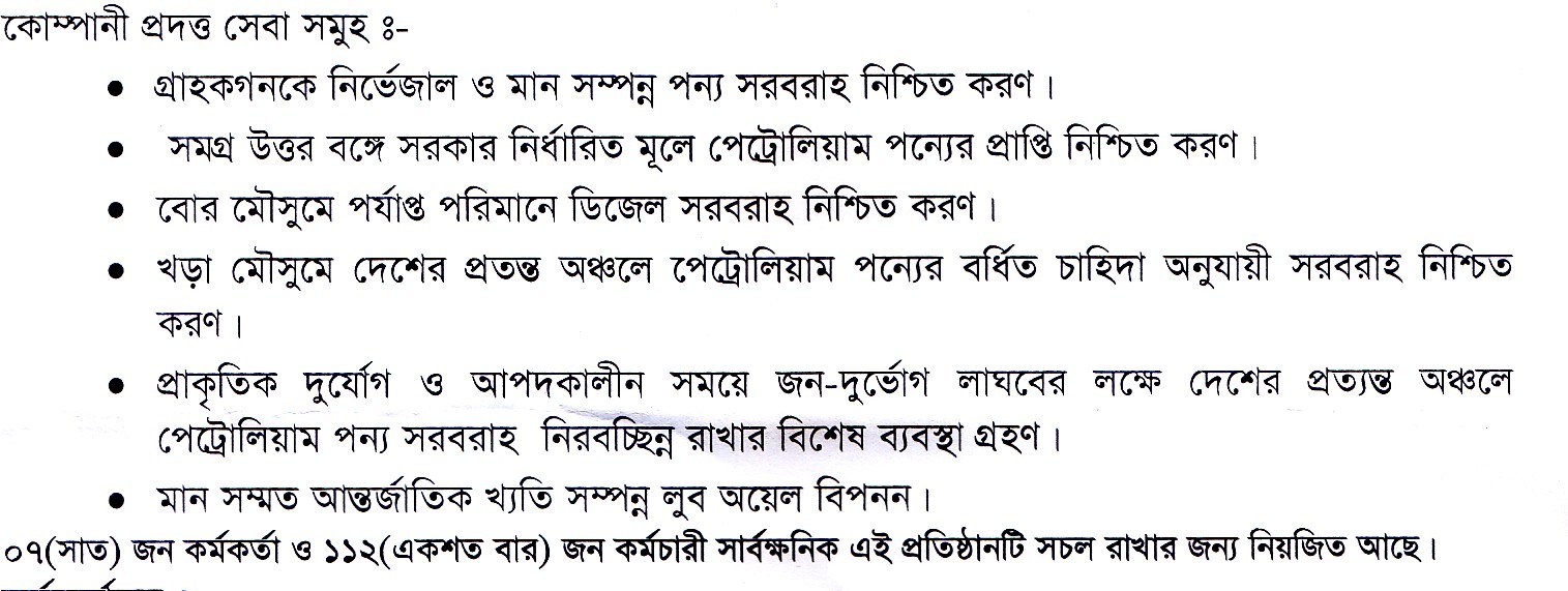 • মান সম্মত আমত্মর্জাতিক খ্যতি সম্পন্ন লুব অয়েল বিপনন। ০৭(সাত) জন কর্মকর্তা ও ১১২(একশত বার) জন কর্মচারী সার্বক্ষনিক এই প্রতিষ্ঠানটি সচল রাখার জন্য নিয়জিত আছে। কর্মকর্তাবৃন্দঃ-